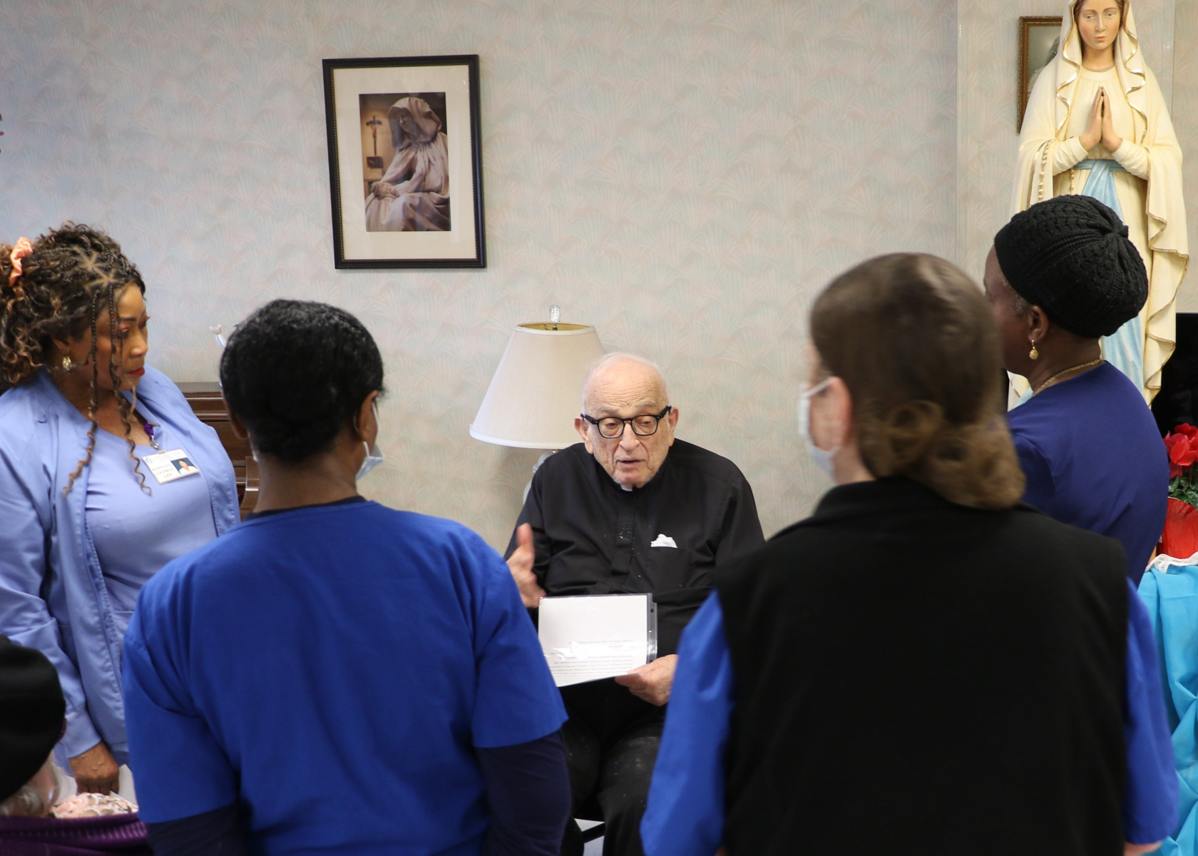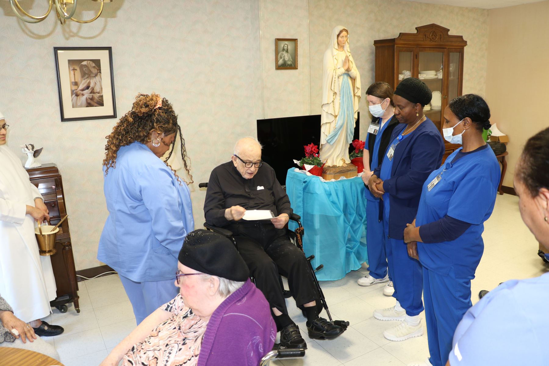 When staff joined the devotion, Msgr. Bazan offered a heartfelt prayer and blessed the hands of “the workers who care for the aged poor.” He prayed that God, the Divine Physician, would strengthen their hands, guide their minds and fill their hearts with merciful love and compassion; grant them wisdom, skill and patience; protect them from burnout and despair; and help them see Christ in every Resident as they serve with charity, seeing their work as a holy calling.